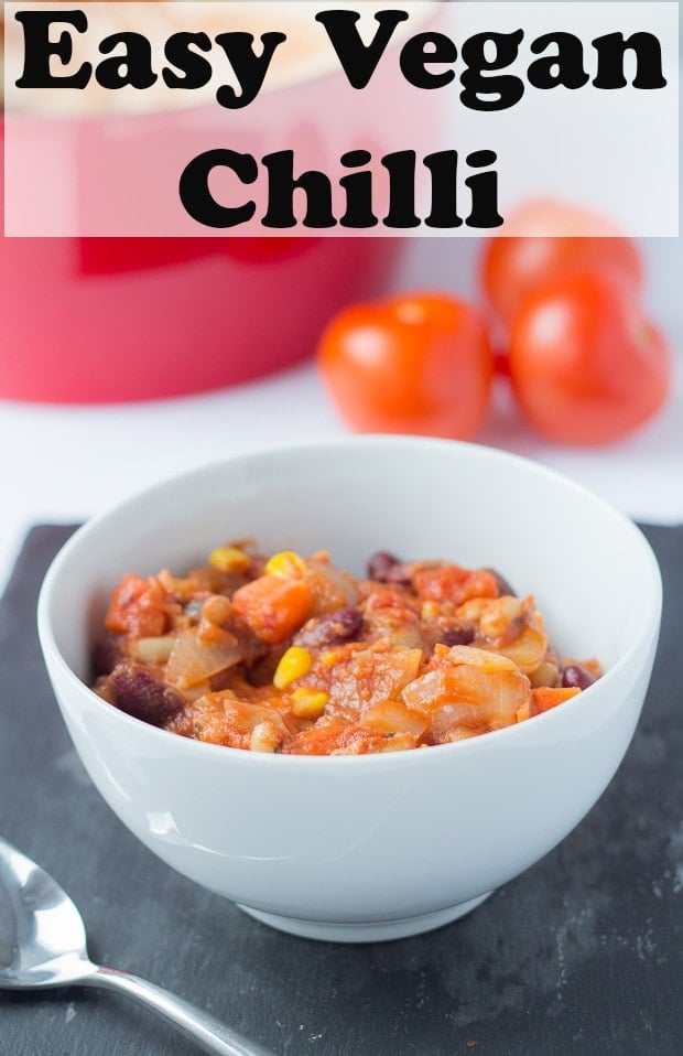 Easy vegan chilli is an all in one pot healthy and delicious bean chilli recipe. Packed full of vitamins with this meal you'll find you won't be missing meat at all!