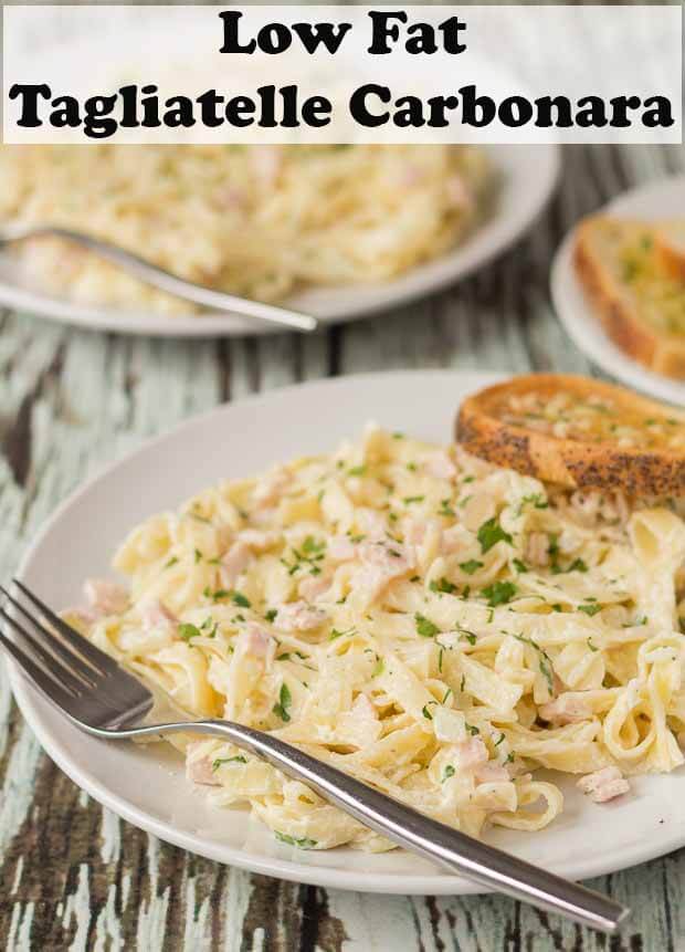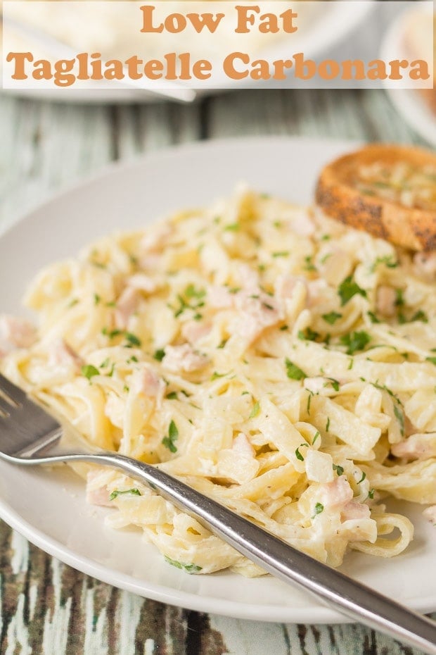 This healthier low fat tagliatelle carbonara recipe is so creamy folks!