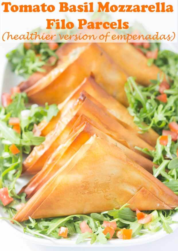 Tomato basil mozzarella filo parcels are a delicious healthier version of Empanadas. All the classic flavours you would expect from a tomato basil mozzarella Empanada but with less calories and fat!